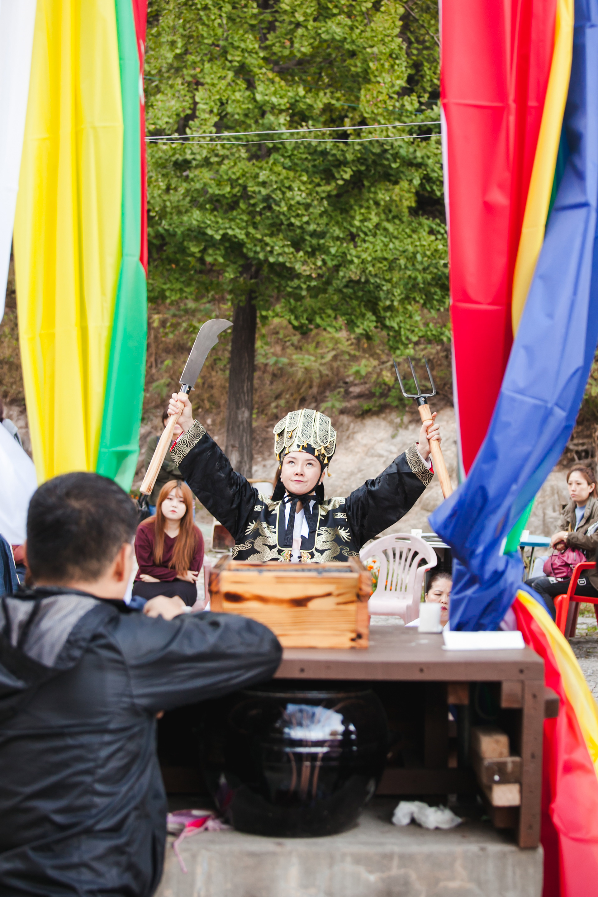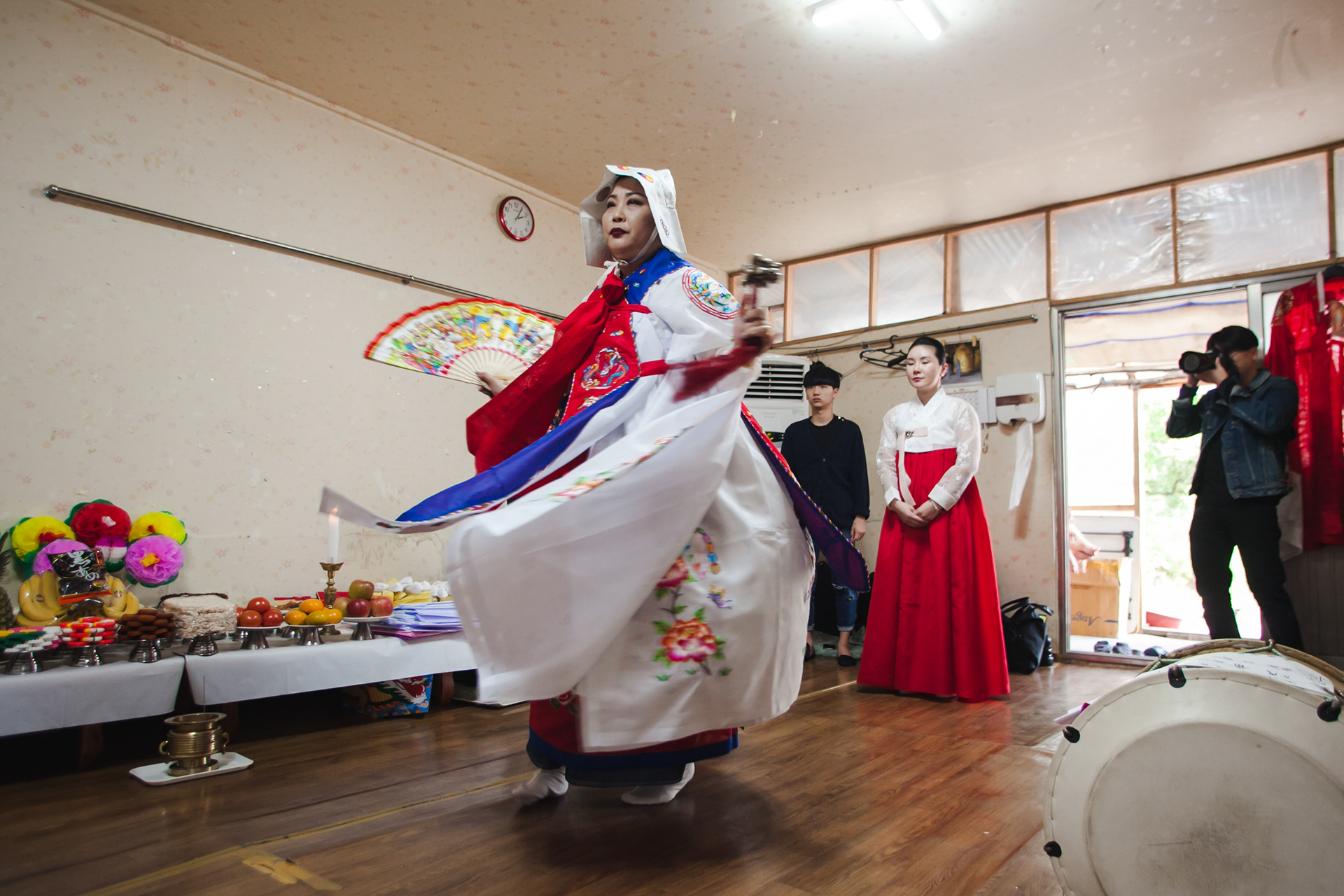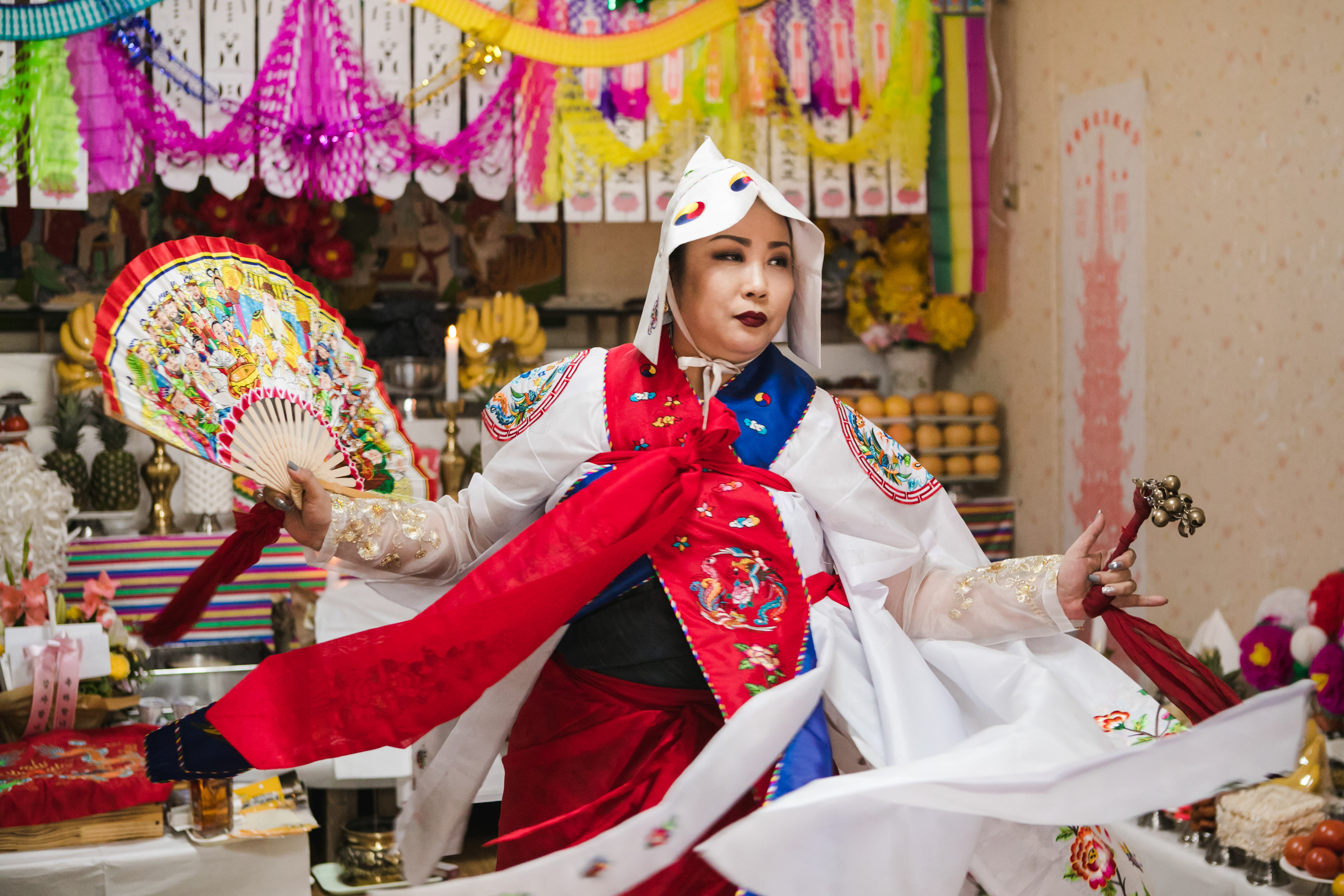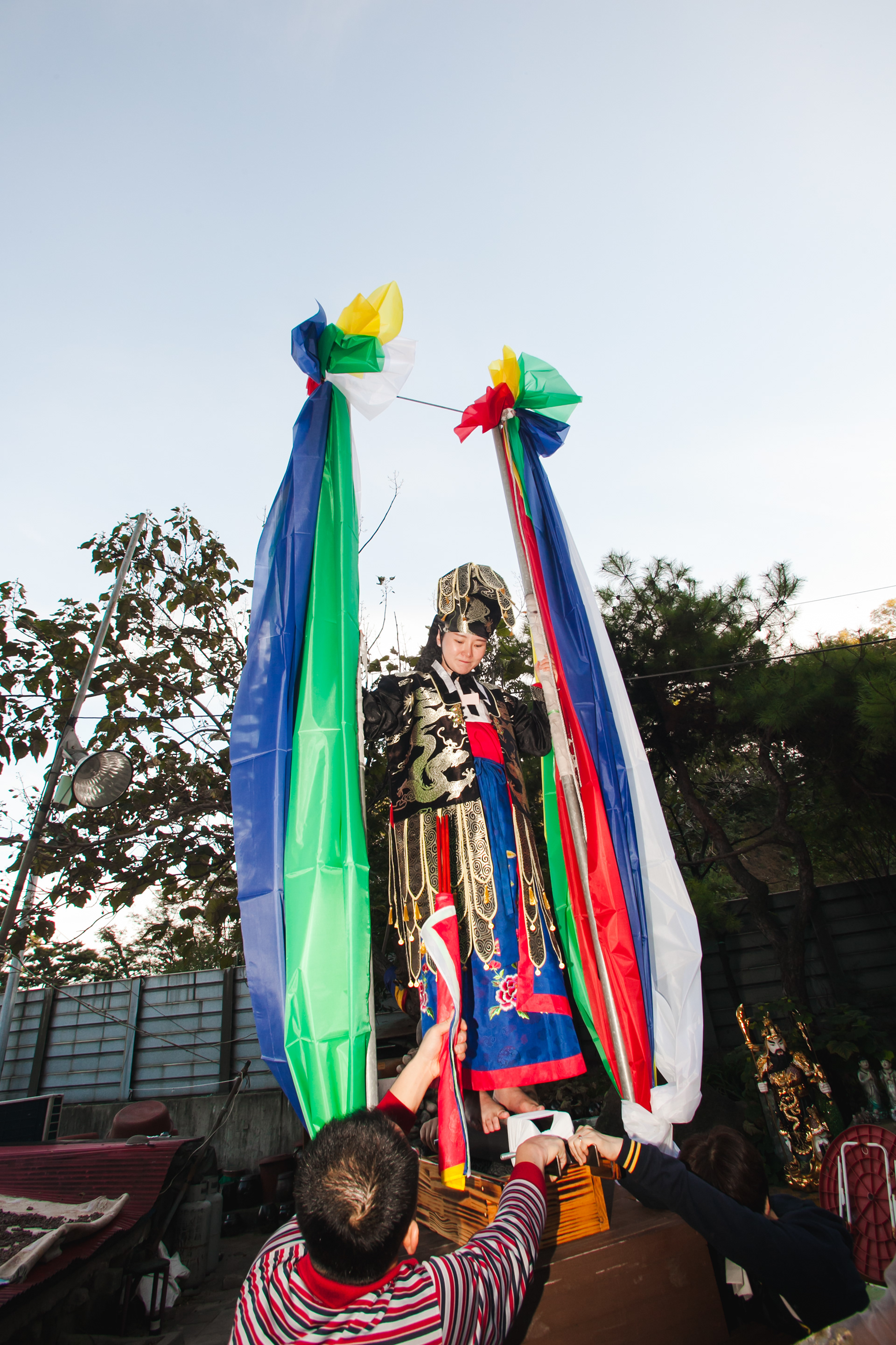 Good [gut] is traditional shamanism, and many of Korean believes Good will kick out evil sprits and bring good luck. Byul-Dang Sunnyu is a shaman, called Moodang [mu:dang]. She invited Youngwoo filming her biggest practice how she accepts God and ancestor, so she can build up her power and ability of fortune telling and prophecies. The Climax of this practice is when God entered the body, she stood on a sword edge. Youngwoo filmed the beginning to the ending of her practice in July 2018.